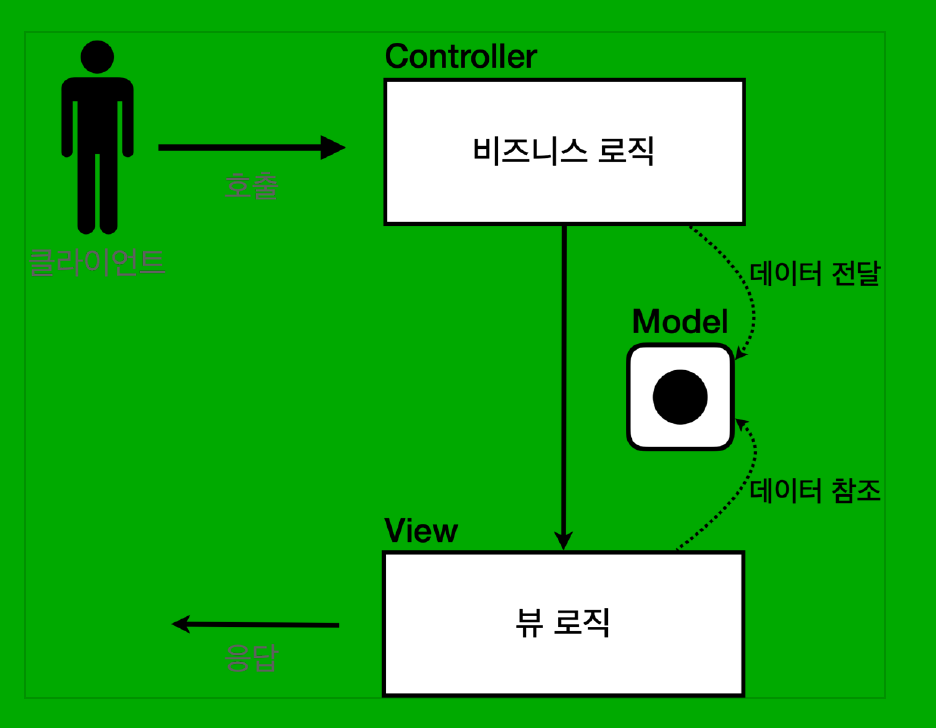Model = 뷰에 출력할 데이터를 담아둔다. 뷰가 필요한 데이터를 모두 모델에 담아서 전달해주는 덕분에 뷰는 비즈니스 로직이나 데이터 접근을 몰라도 되고, 화면을 렌더링 하는 일에 집중할 수 있다.