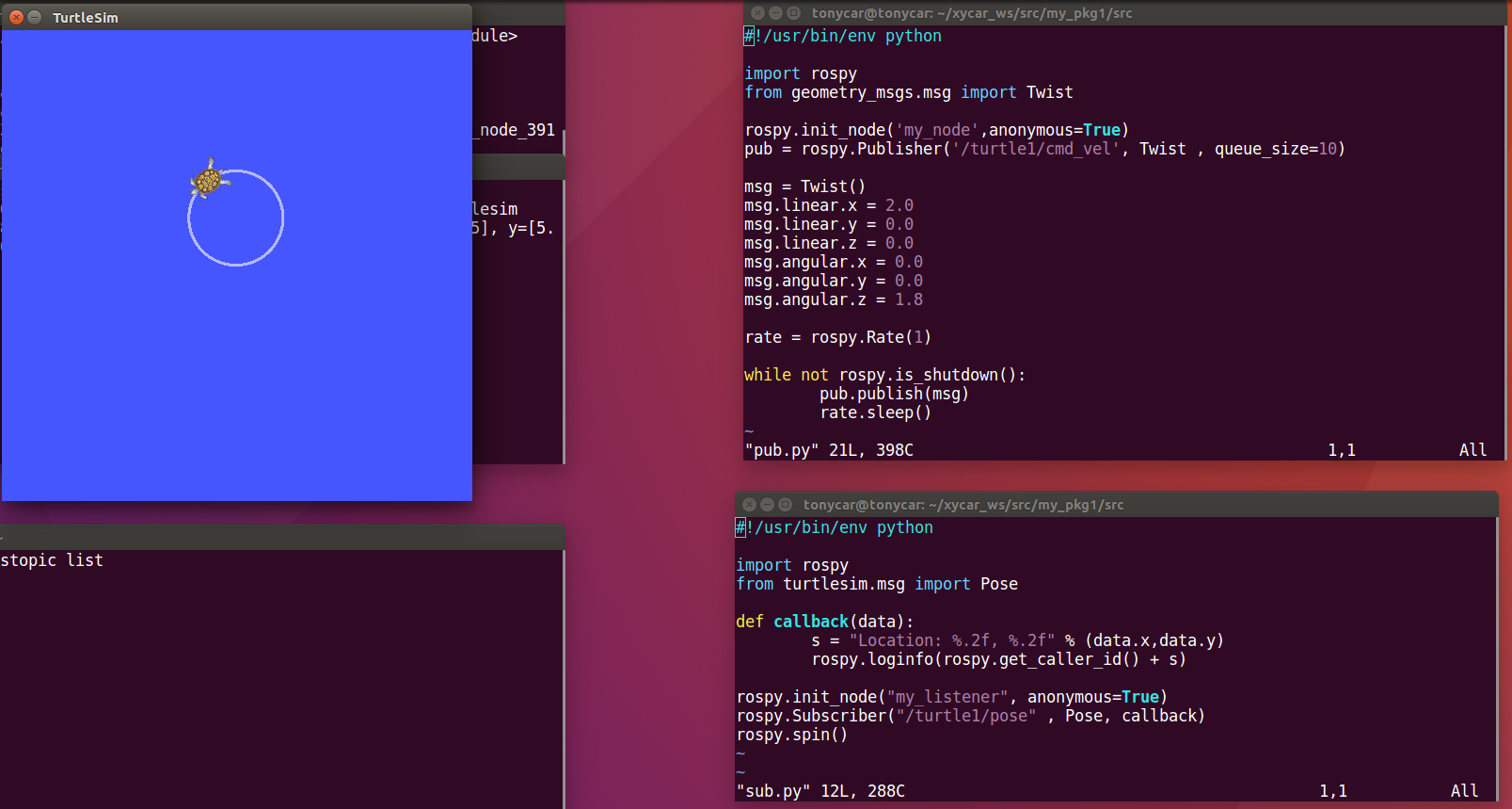 sub.py == subscriber로 /turtle1/pose 토픽을 계속 수신한다. 수신될 때마다 callback 함수를 호출하여 로그를 찍는다. rospy.spin() == 거의 무한루프의 의미이다.