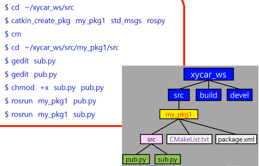 3. 발행자 노드 구동 == 특정 토픽 메세지를 발해하겠다는 의사를 전달한다. 이때 마스터 입장에서는 구독자가 무슨 메세지를 원하는것을 아니까 둘을 tcp로 연결시켜준다.