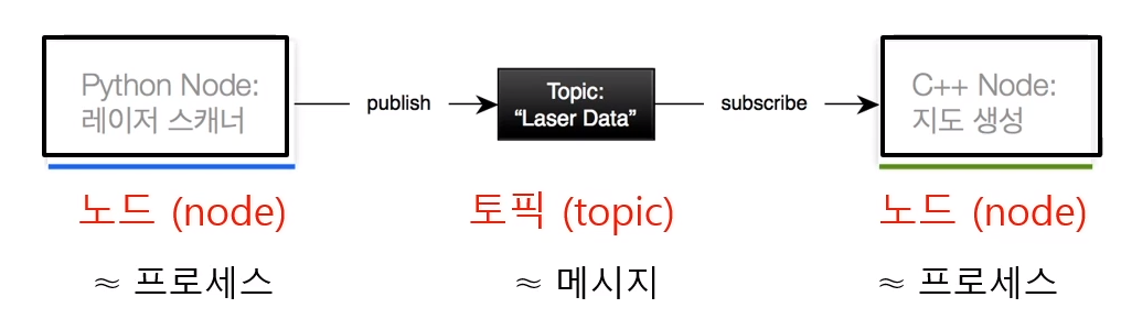 토픽 == ROS 노드들이 관심을 가지고 있는 이야깃거리 , 그안에 실제 들어있는것들은 메시지 라고 부름
