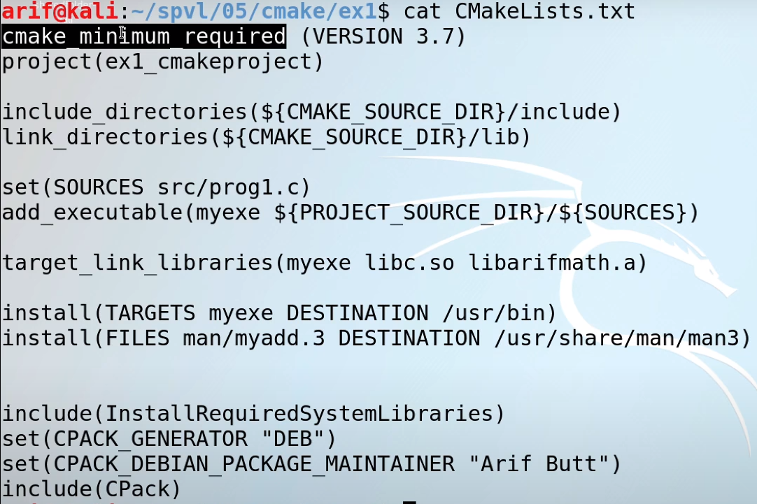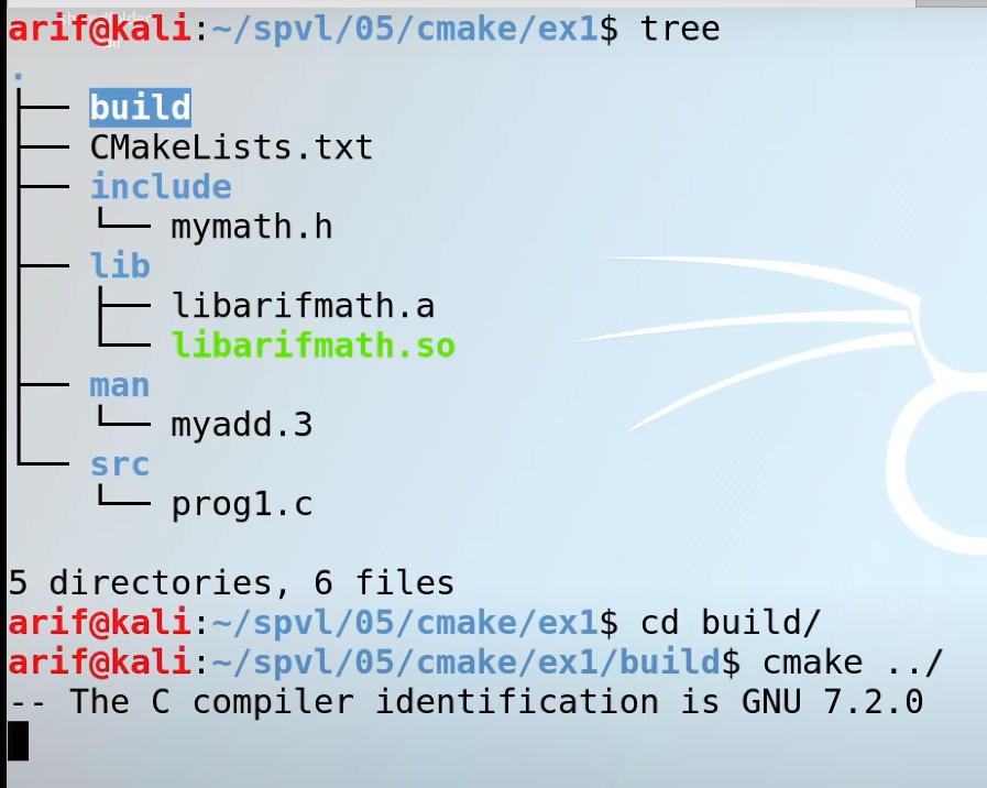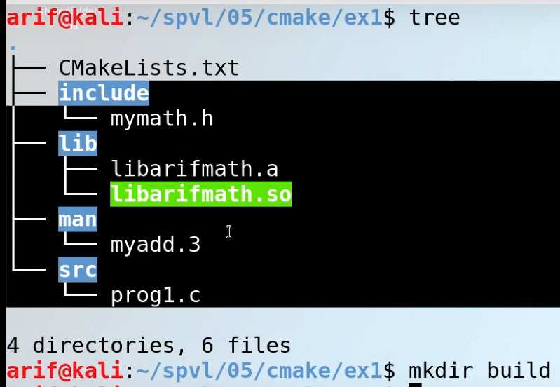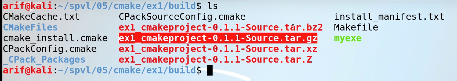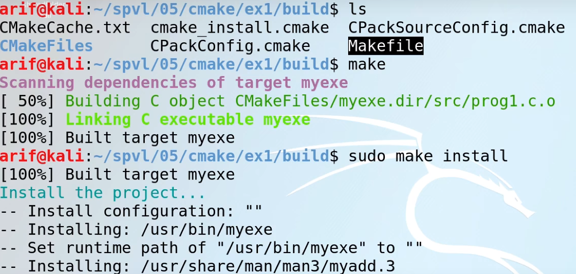 after "cmake" , inside build folder Makefile is created. and with "make" we can use our myexe exectuable.