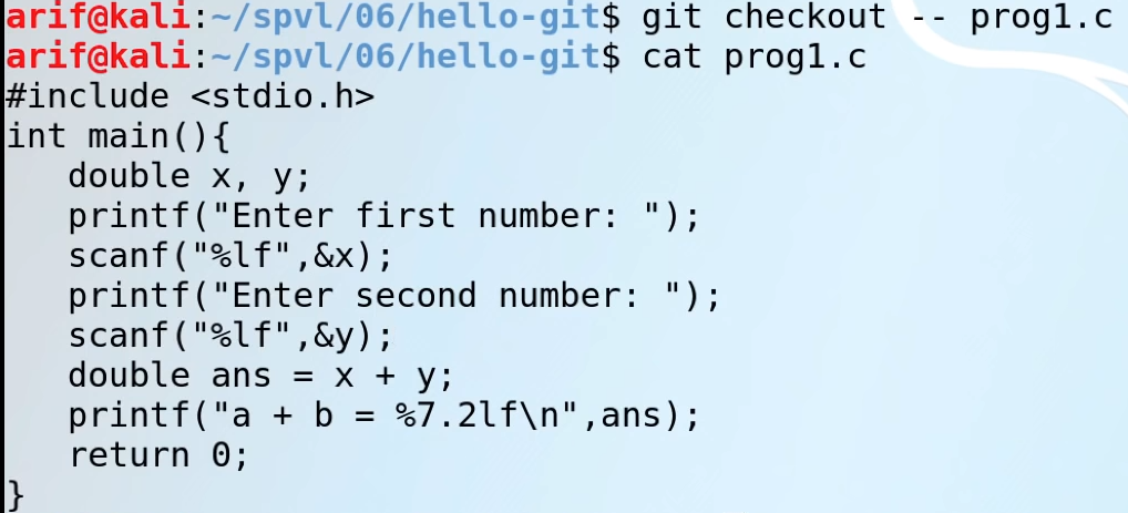by "git checkout -- prog1.c" we can bring our repository prog1.c