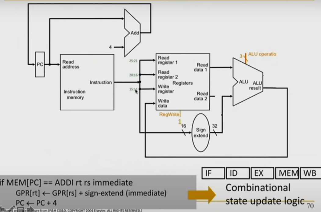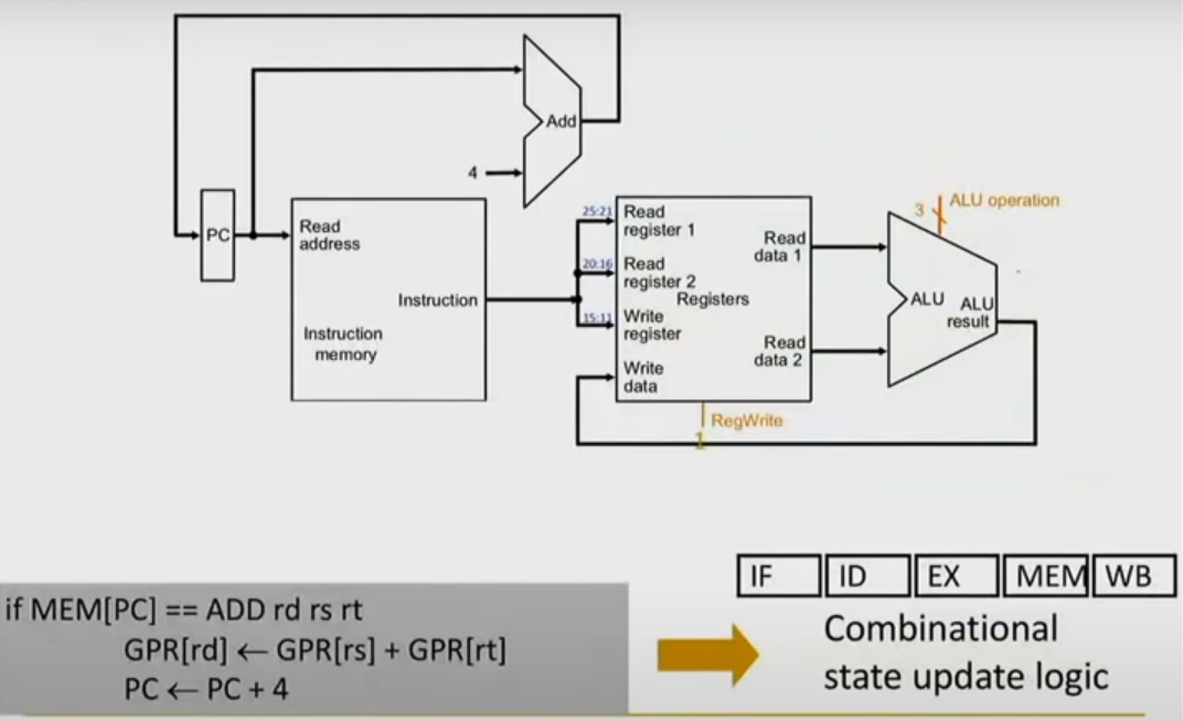 translating semantics into combination state logic. first line (add) , second line (PC update) happen parallely.