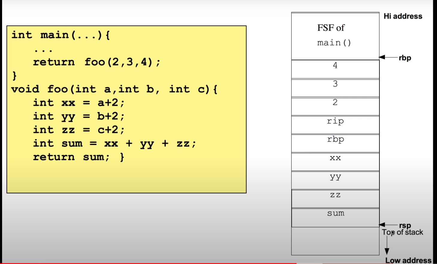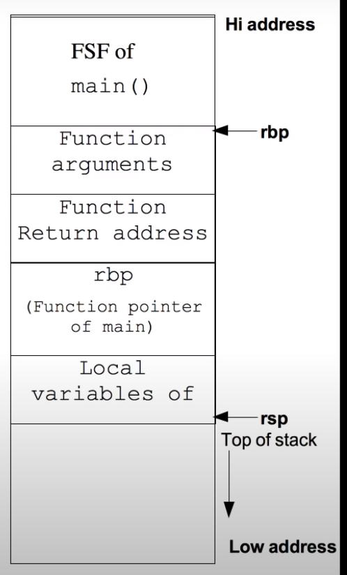 rbp block is containing starting address of "main" stack frame is saved on stack for alter use, and rbp pointer is moved to where rsp is pointing , to create new stack frame pointe rof function foo()