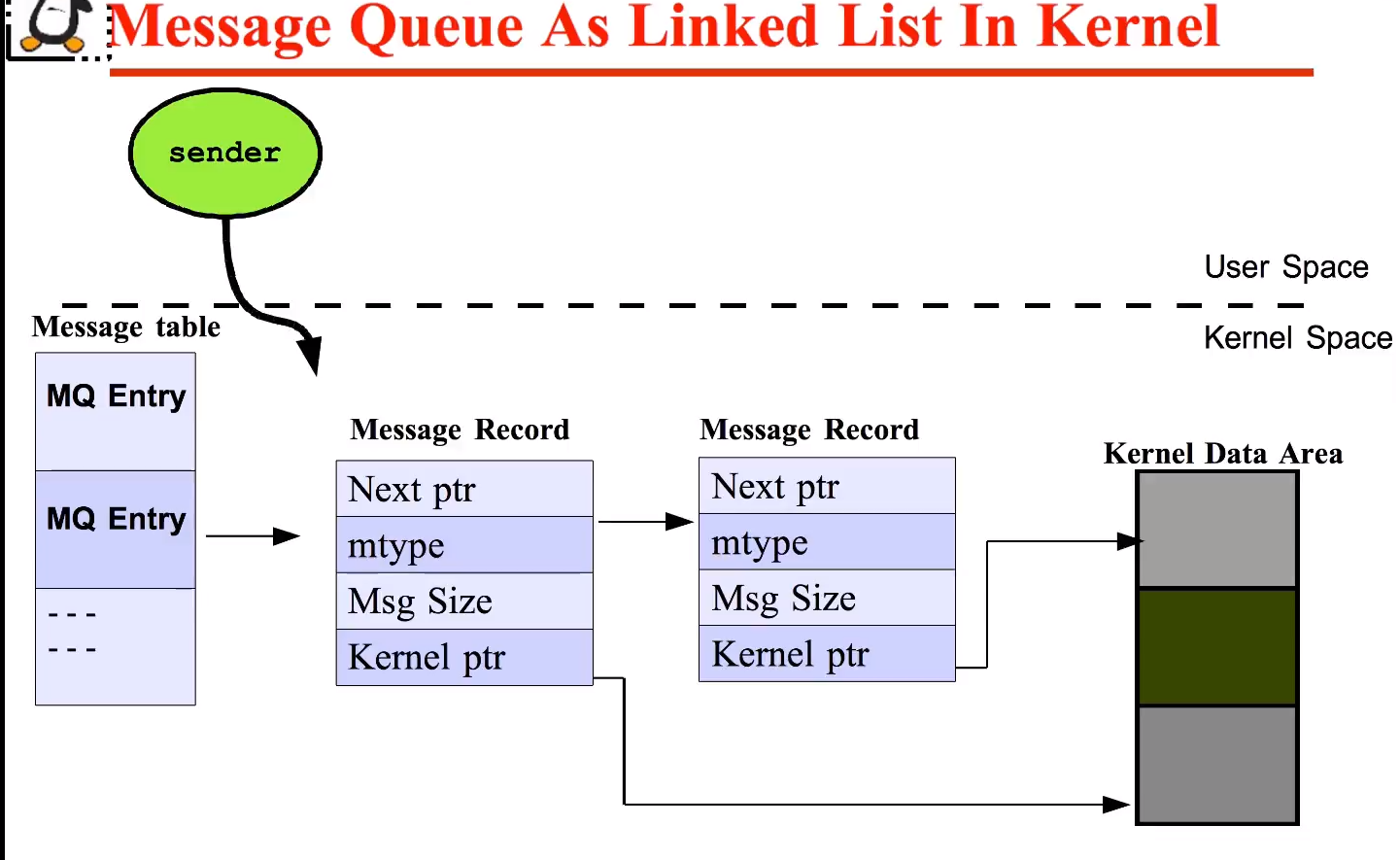 A message queue can be thought of as a linked list of messages in the kernel space. Processes with adequate permissions can put messages onto the queue and processes with adequate permissions can remove messages from the queue.