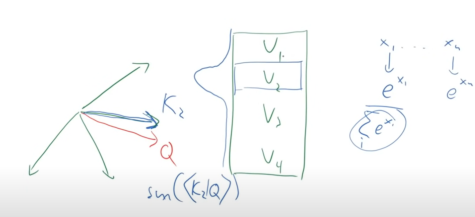 dot product of keys and query = gives angles between these 2 vecotors , if both of them are pointing to same direction result will be large