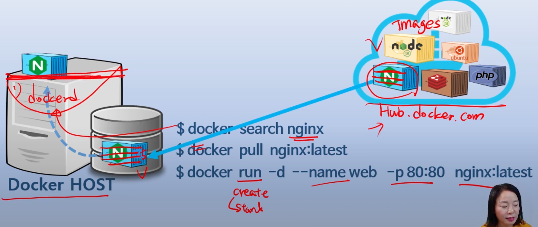 도커 public hub에서 container image를 가지고와서 docker daemon에서 실행시킨다.