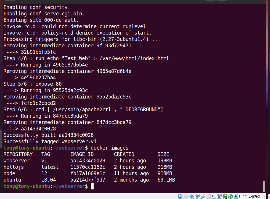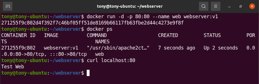 docker run 으로 잘 실행된것을 확인할 수 있다. 80 포트로 들어갔을때 index.html 에 Test Web도 dockerfile에서 설정한 것 처럼 잘 작성이 되었다