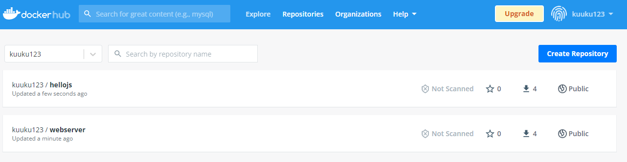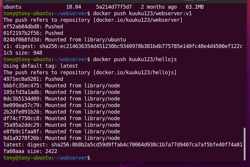 이제 잘 동작하는 이미지들을 docker hub에 올려보자 로그인을 하고 tag를 통해 이름을 바꿔줘야한다.