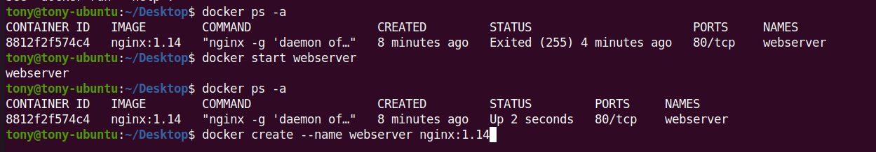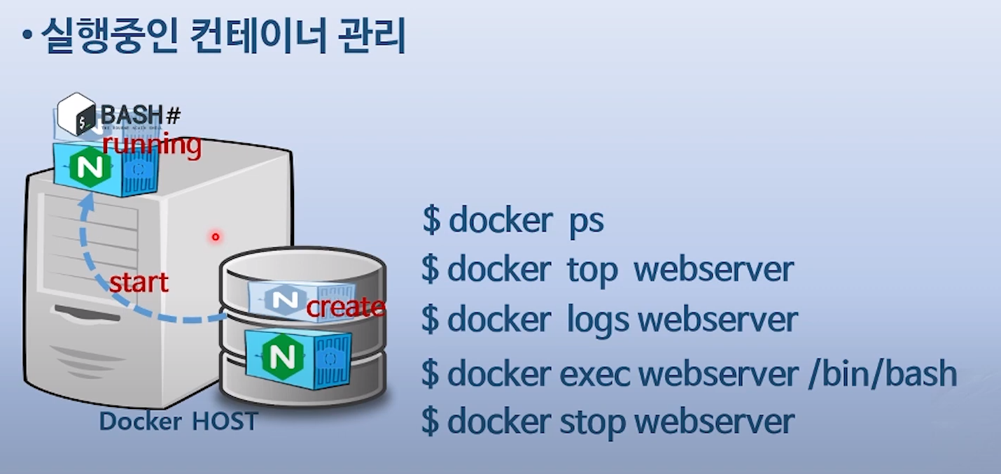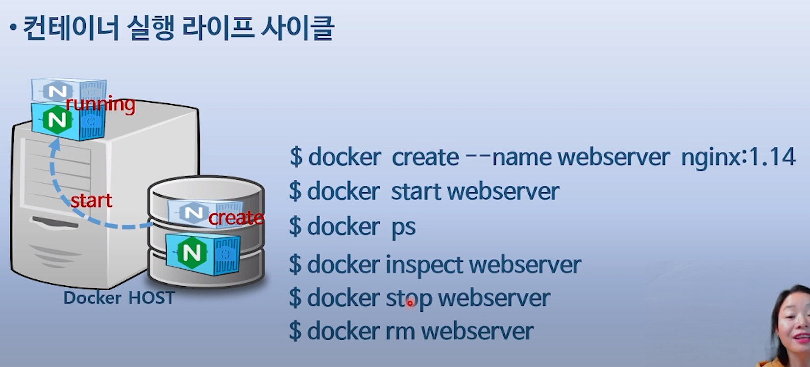 받아온 image에서 create를 통해 이름을 지정해주고 (webserver) container를 생성한다. start 명령어를 통해 진짜 실행시킨다.