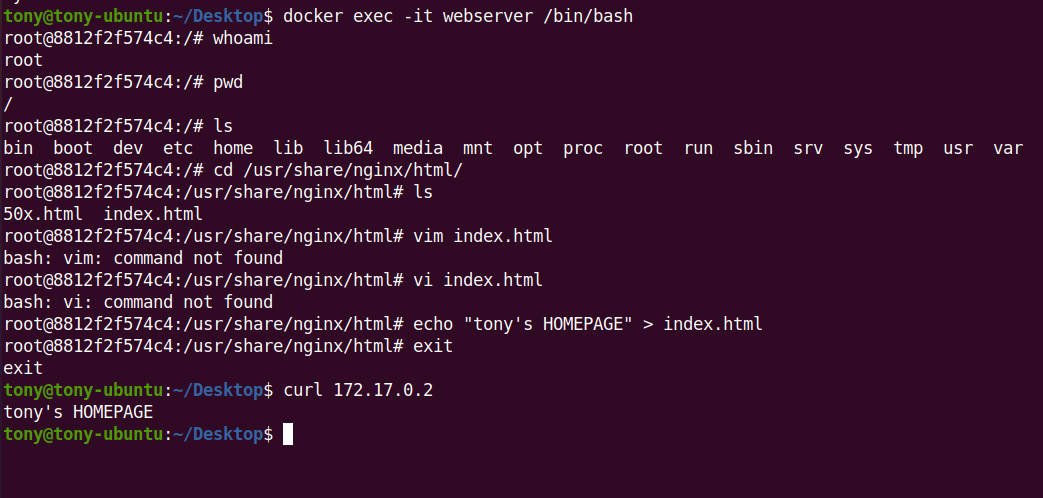 exec 명령어를 통해 -it (interactive , terminor) 를 추가하여 현재 동작하고 있는 webserver 컨테이너에서 bash shell을 이용하여 접속하였다.