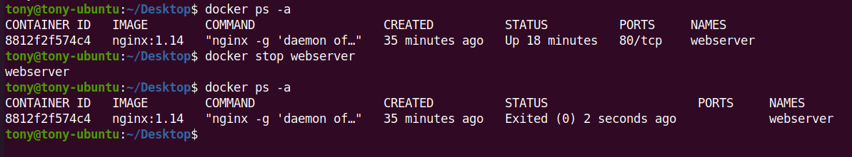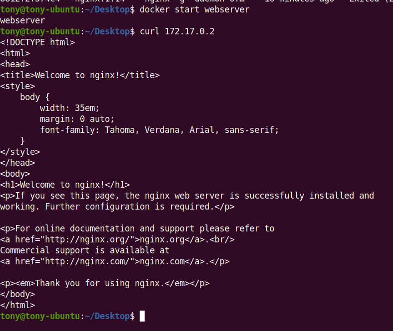 stop 명령어를 통해 webserver 컨테이너를 종료시켰다. 다시 start하면 실행 된다.