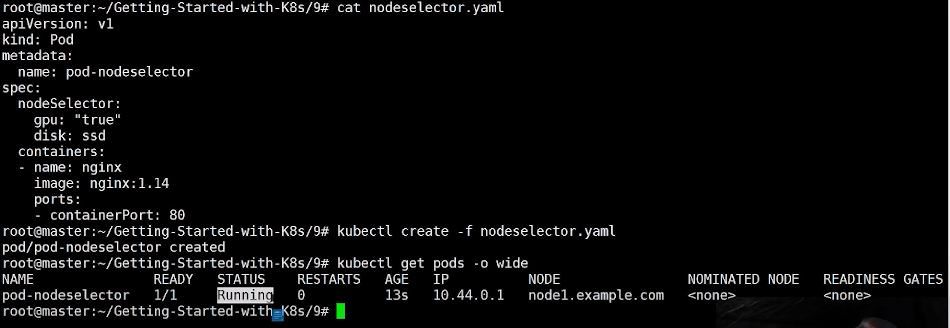 만약 node selector에 조건에 해당되는 pod가 없다면 Pending 상태로 알맞은 node가 생길떄까지 대기할 것이다.