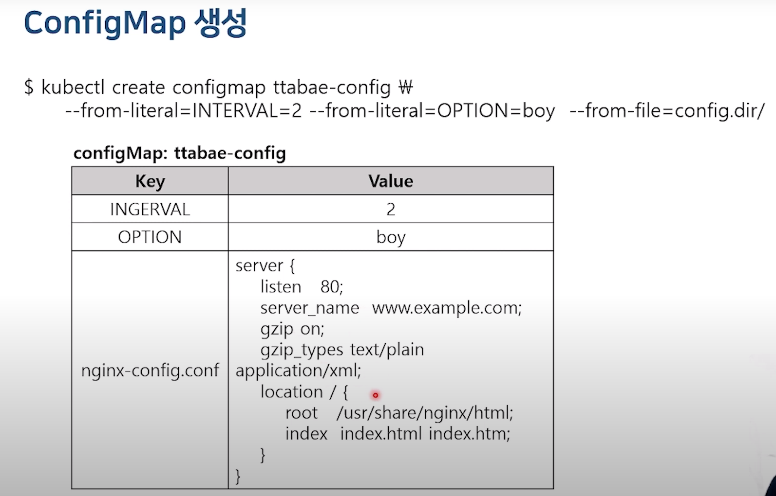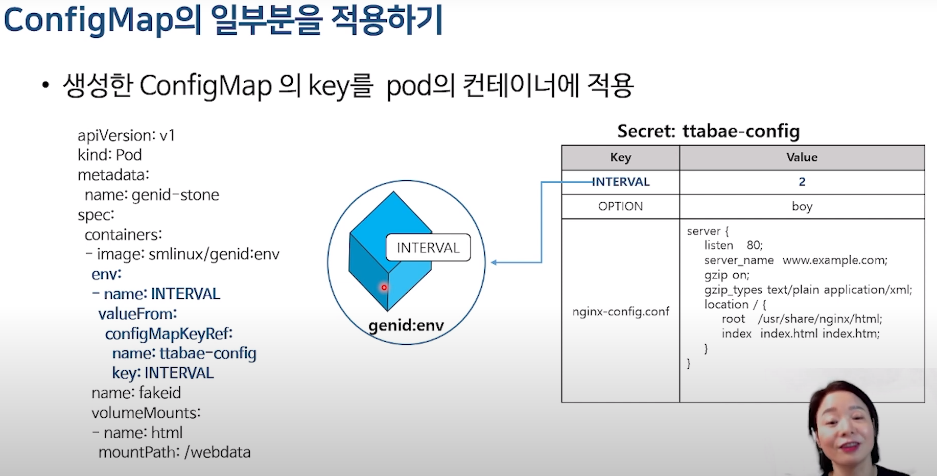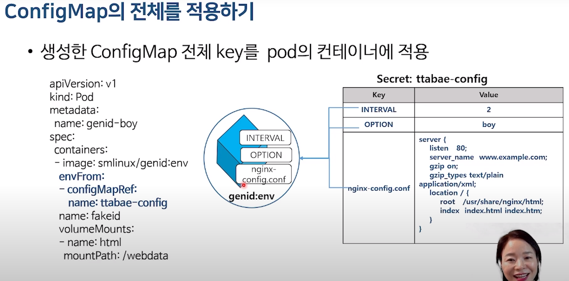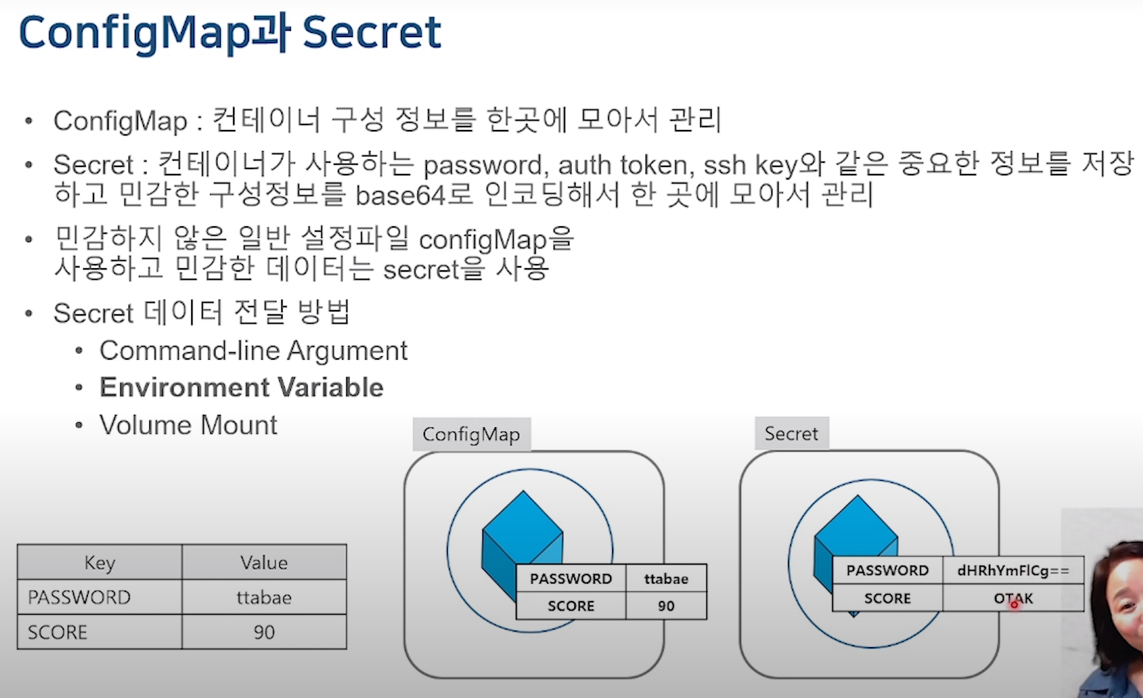 ConfigMap 에서 민감한 데이터는 secret으로 만들어서 사용한다.