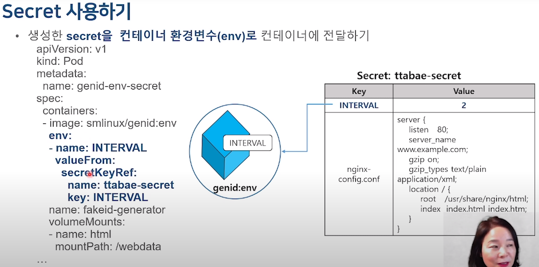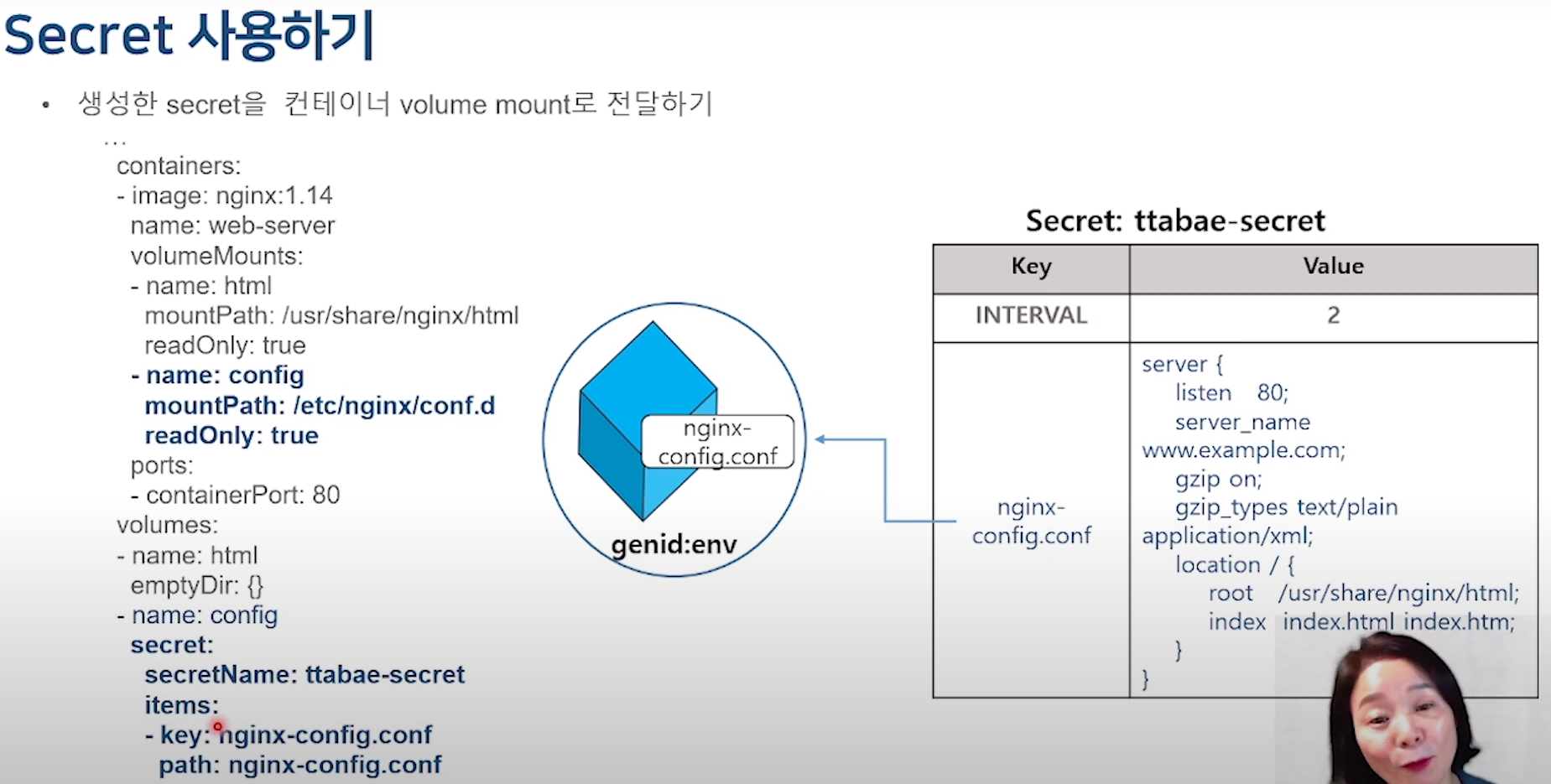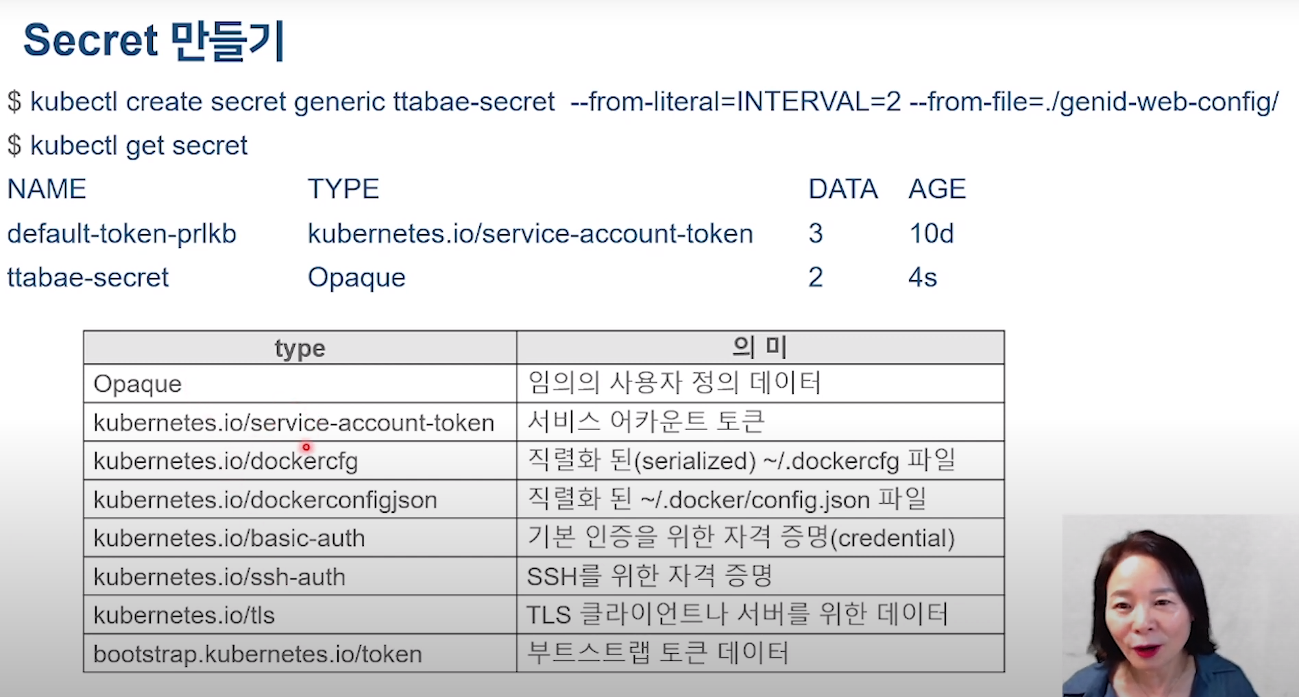 밖에서 kubectl get secrets <secret-name> -o yaml 형태로 확인하면 base 64로 인코딩 상태로 알아 볼수 없게 나온다.