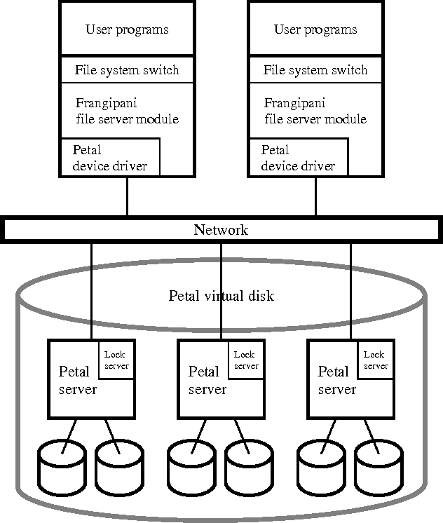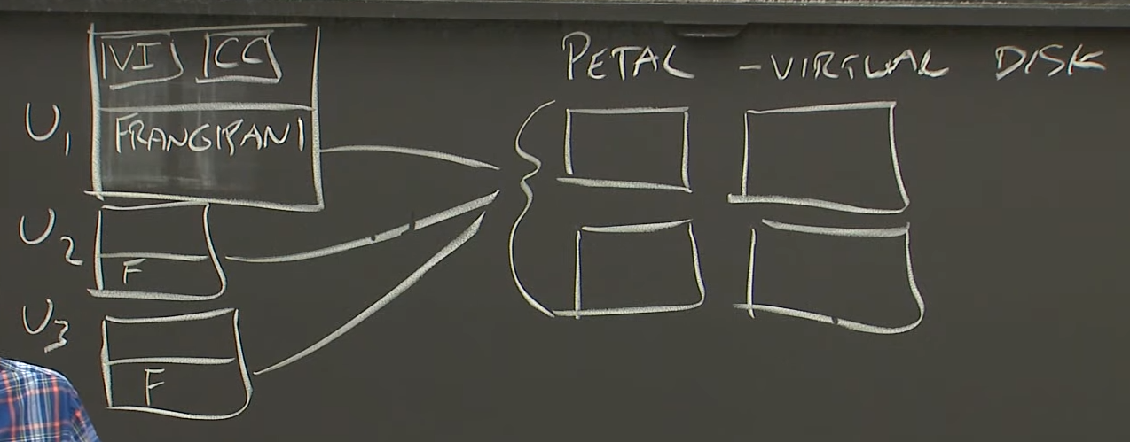 petal = act as diskdrive that are sharable to Frangipani(F)[FileSystem]