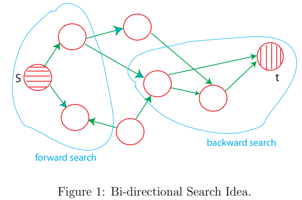 alternate forward search from s backward search from t and calculate each df(u) , db(u).