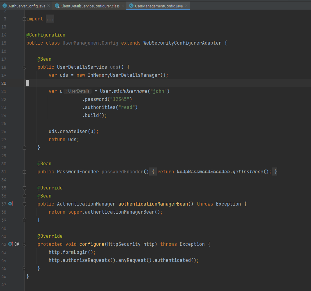 similar to UserDetailService -> clients.InMemory == InMemoryDetailsManager