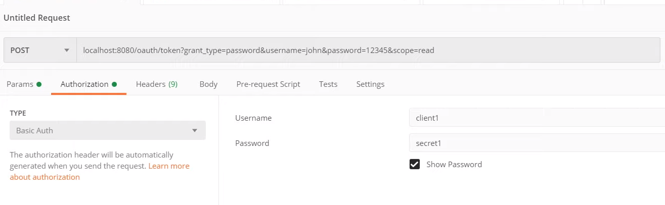 client is sending user's id +password , client's credential( client1, secert1)