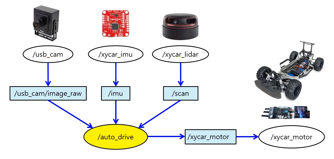 각종센서들이 여러 토픽을 /auto_drive 노드에게 보내주고 그것을 처리하여 /xycar_motor 노드에게 토픽을 쏴주어 컨트롤 하는 방식이다