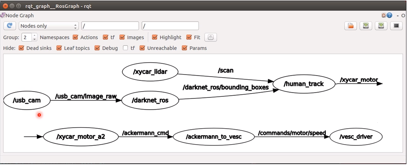 YOLO 를 구성하고있는 darkent을 통해서 사람을 detect하고 lidar를 통해 거리를 측정한 정보를 /human_track 노드에 넣어주고 처리하여 xycar_motor 토픽을 발행한다.