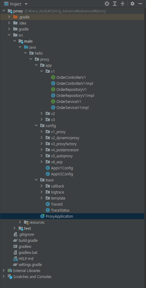 원래는 해당 ProxyApplication이 존재하는 패키지 부터 (proxy) 밑으로 쫘악 component scan을 하지만 여기서는 Configuration을 계속해서 바꾸길 원하기 때문에 basepackage의 위치를 변경하였다.