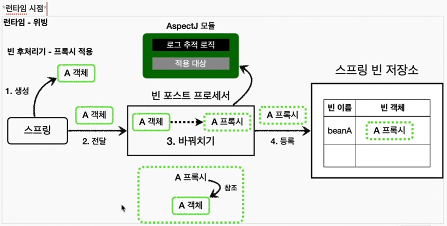 런타임 시점은 main 메서드가 이미 실행된 이후의 시점이다. 여태 학습한것이 프록시 방식의 AOP 적용 방식이다.
