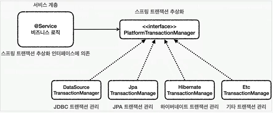 실제 구현체가 변경이 있어도 서비스 레이어는 TxManager interface만 참조하고 있기에 코드 수정이 필요 없다.