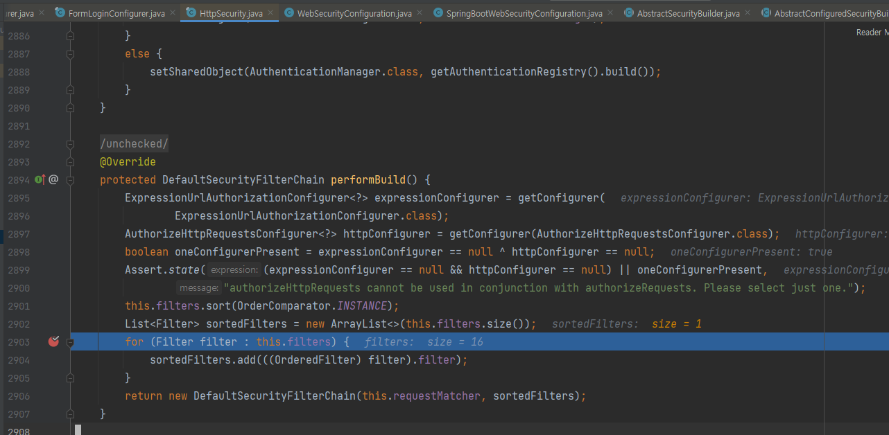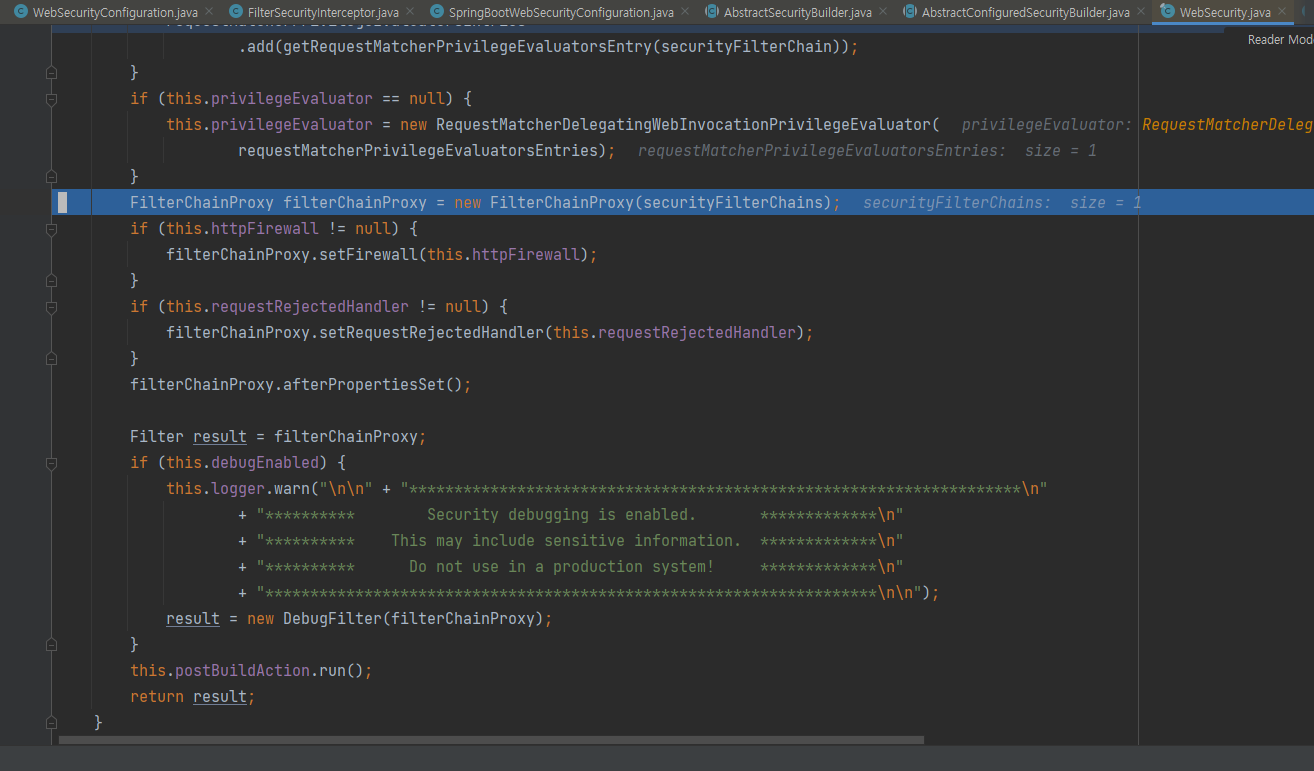 주입받은 FilterChain을 WebSecurity에게 전달해준다. 그다음 build가 호출되어 init configrue performbuild를 호출하게 된다. 하지만 WebSecuirty 설정클래스들이 deprecated 되었기 때문에 init configure는 아무것도 하지않는다.