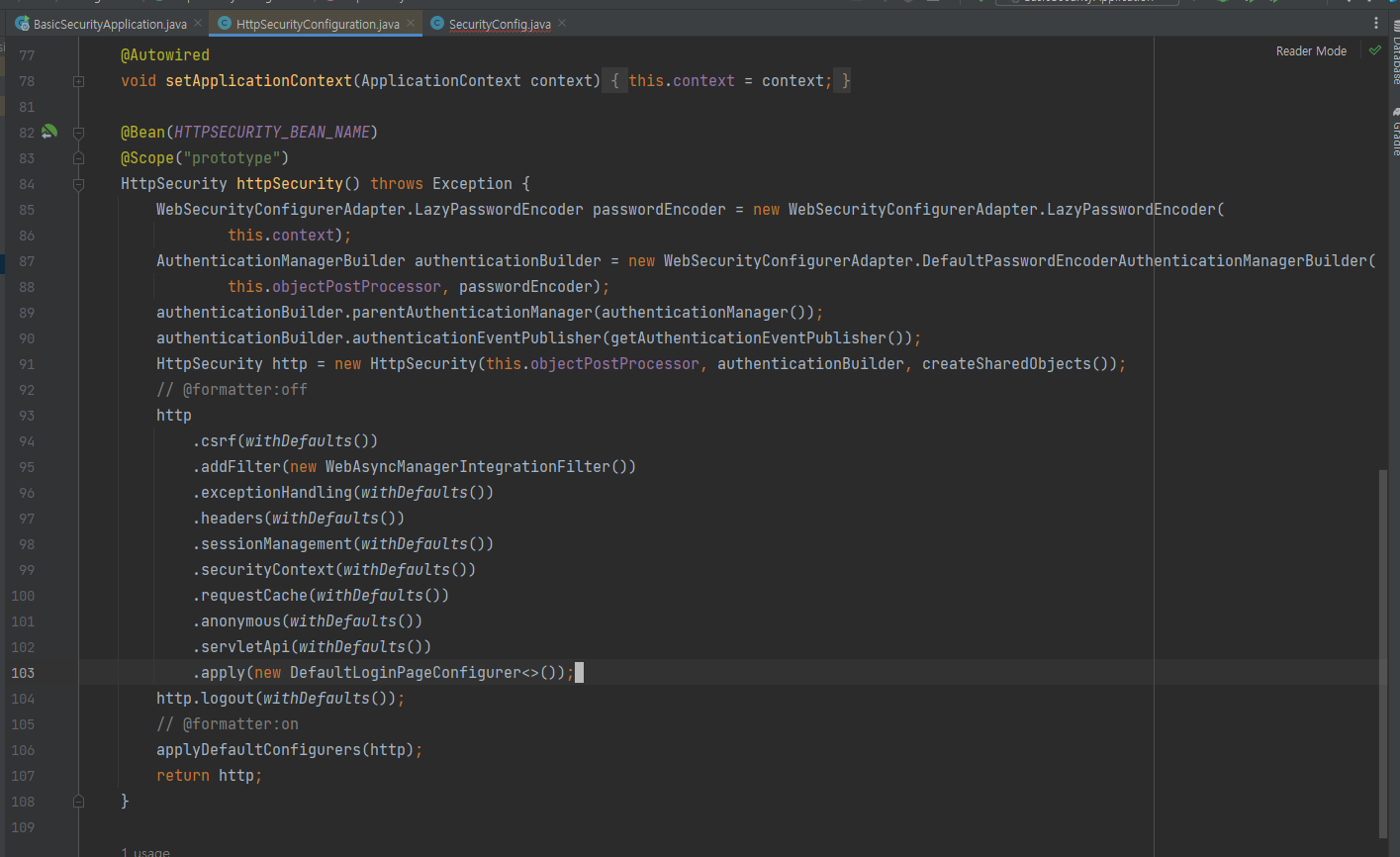 Custom HttpSecurity설정이 없다면 기본적인 SecurityFilterChain을 만들어주게된다. 위에서 만든 HttpSecurity를 주입해준다. 추가적으로 formLogin()은 FormLoginConfigurer 를 추가하고 httpbasic도 자신의 Configurer를 추가하게 된다.