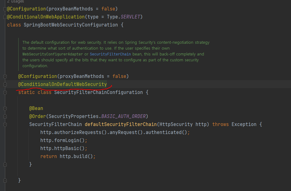 위에서 만든것처럼 우리가 SecurityFilterChain을 빈으로 만들면 기본 SpringBootWebSecurityConfiguration인 요놈이 따로 동작하지 않는다.