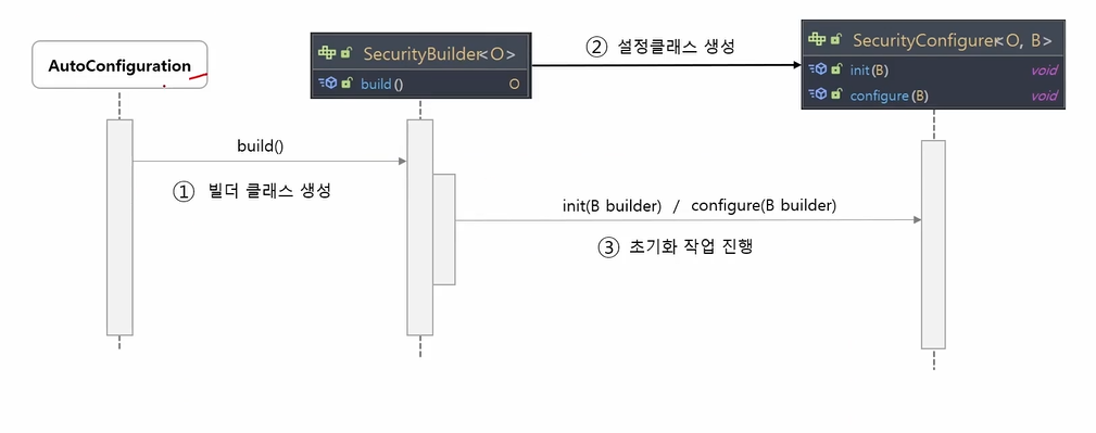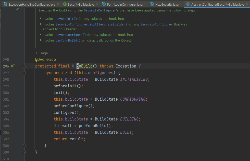 예를들면 HttpSecurity는 SecrurityBuilder의 구현체인데 AbstractConfiguredSecurityBuilder가 상속하는 AbstractSecurityBuilder 안에 build메소드가 존재한다.
