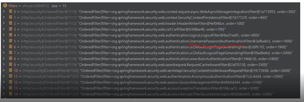 init 과 configurer 호출을 통해 filter들이 만들어진것이다. FilterChain을 만들어서 return하게 되면 하나의 SecurityFilterChain을 bean으로 생성완료인것이다.