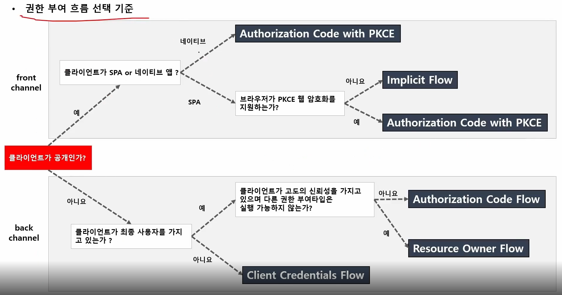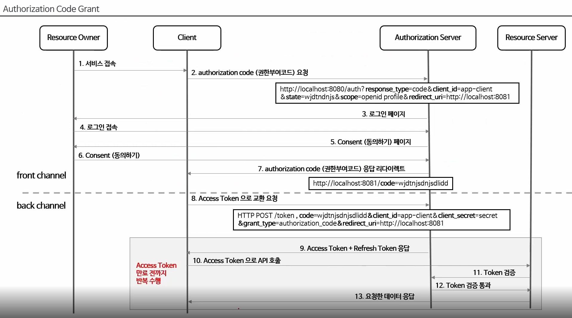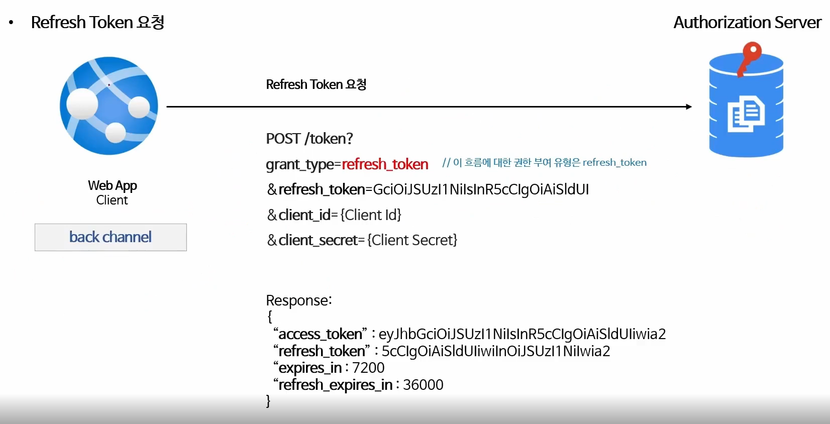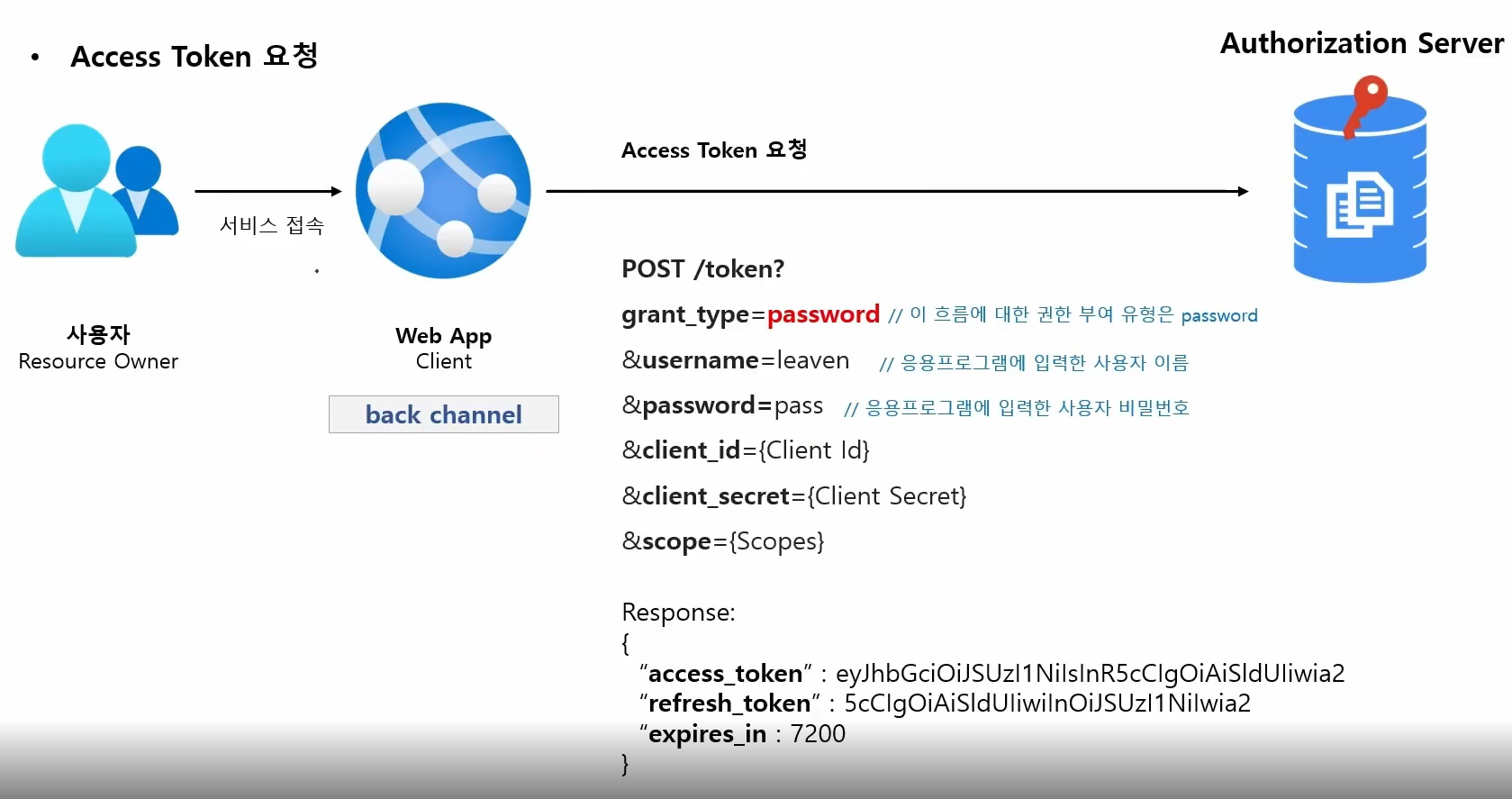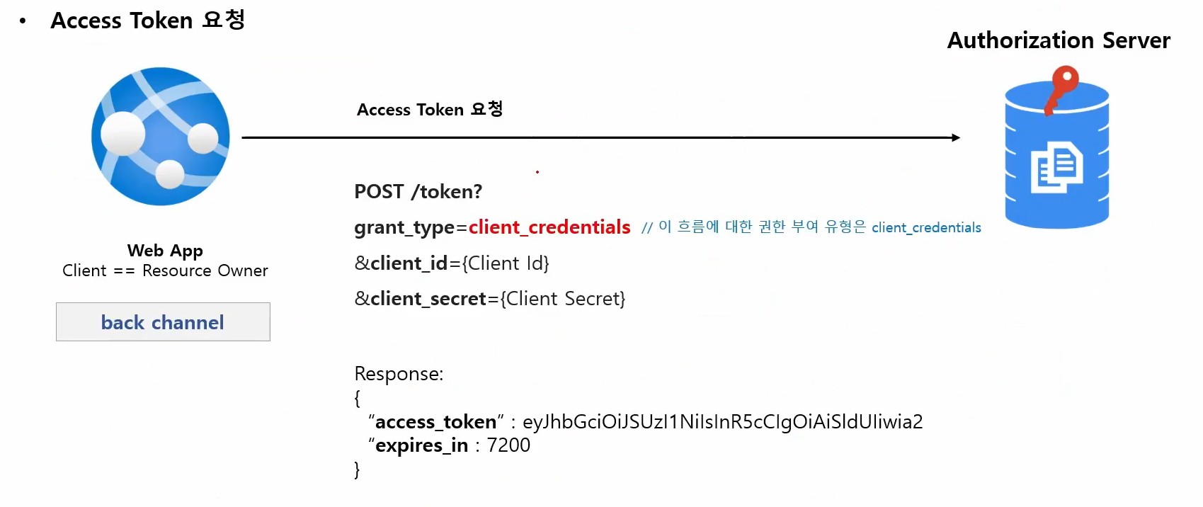 사용자의 id ,pw 를 밖으로 노출 시키면 안되기 떄문에 back channel 에서 주고 받는다.