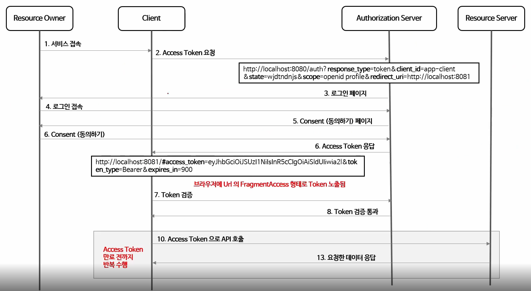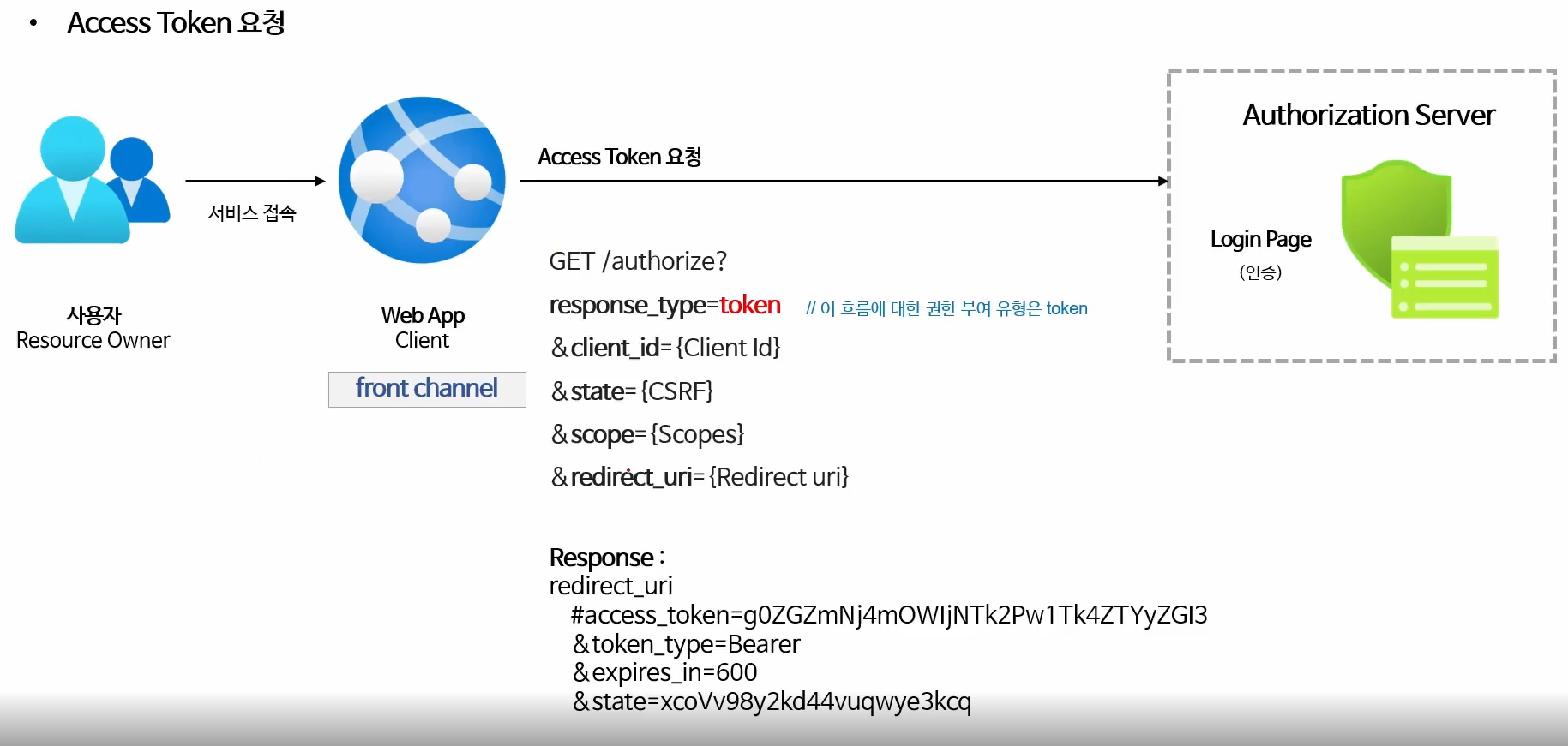2. Implicit Grant Type = 프론트 채널에서 동작함 , 탈취위험이 높음 , deprecated