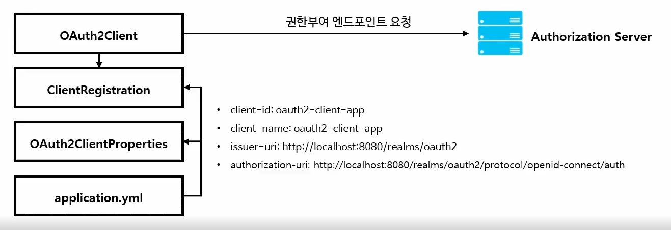 5. OAuth2Client 는 ClientRegistration 를 참조해서 권한부여 요청을 위한 매개변수를 구성하고 auth server와 통신한다.