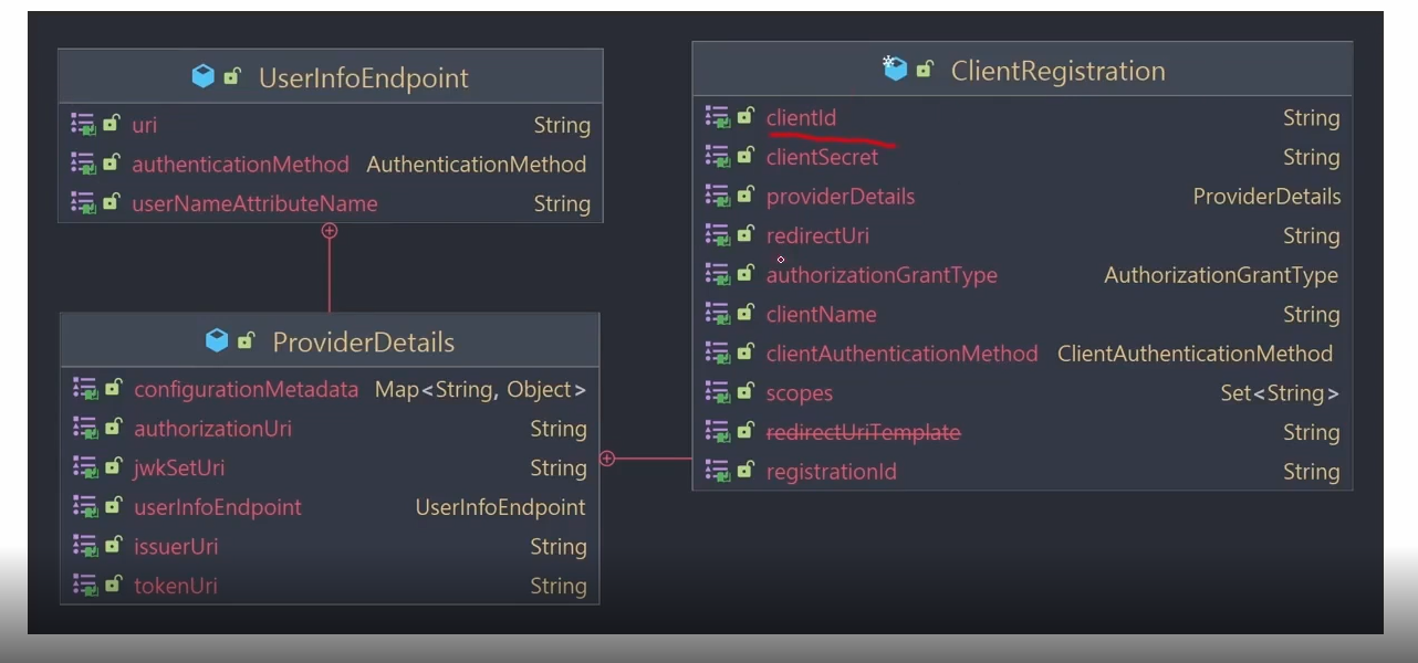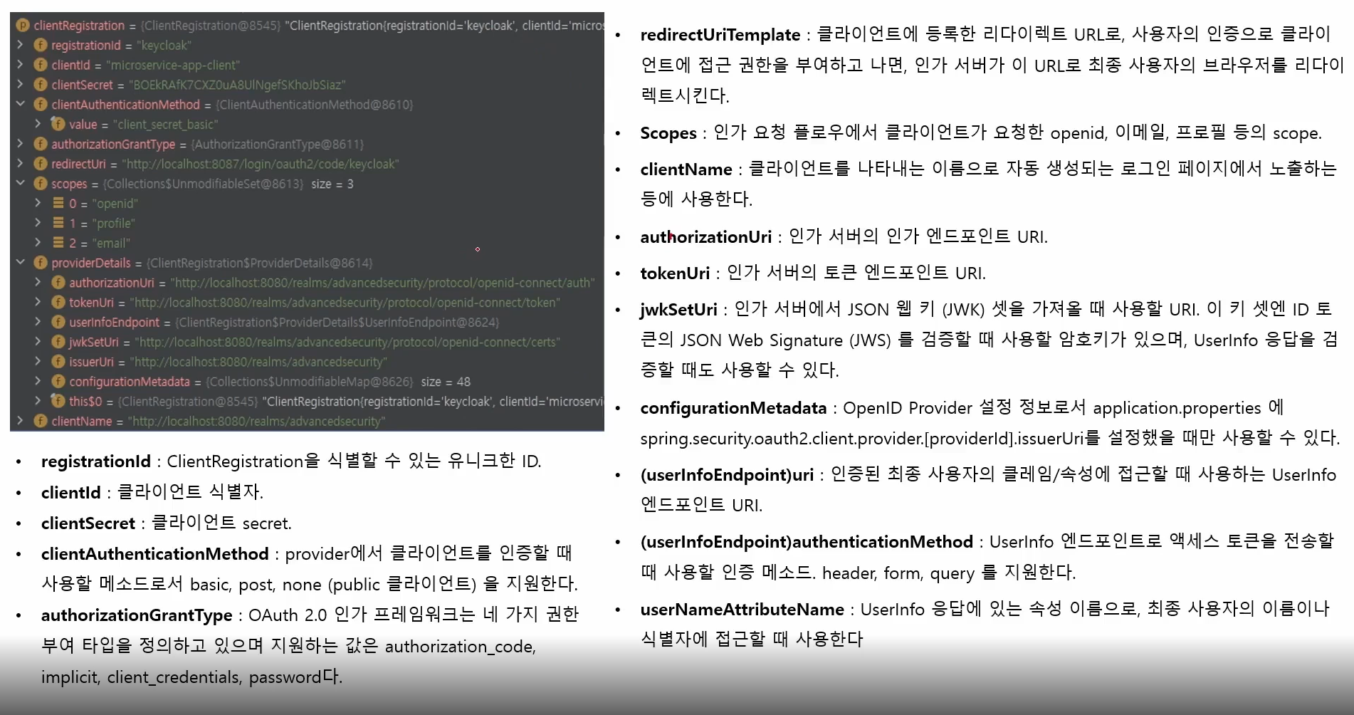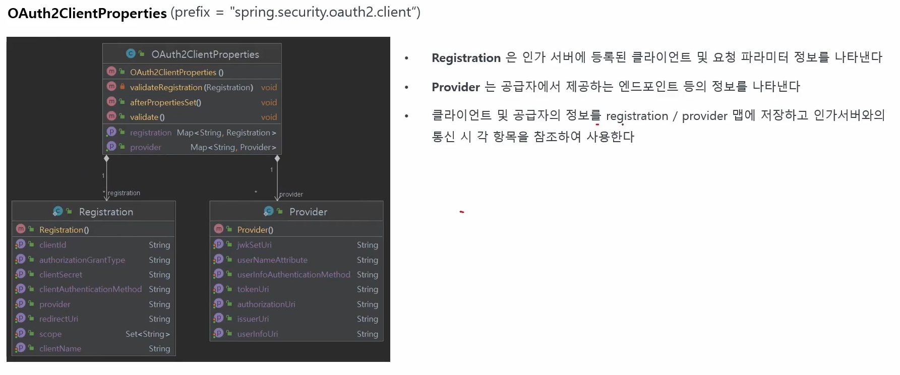 4. OAuth2ClientProperties 에 바인딩되어 있는 속성값은 auth server로 권한 부여 요청을 하기위한 ClientRegsitration 클래스필드에 저장.
