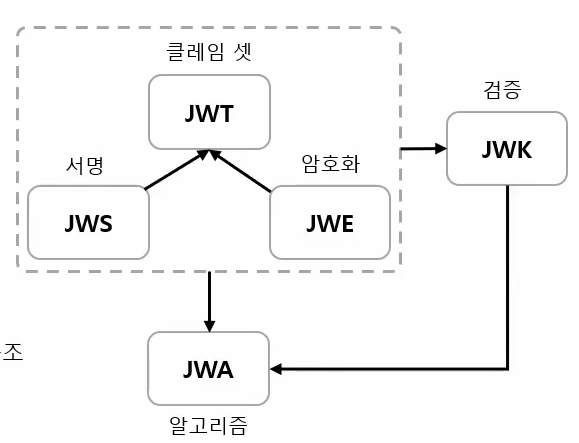 JOSE( JSON Object Signing and Encryption) = JSON 데이터의 컨텐츠를 암호화 또는 서명의 형태로 나타내기 위해 IETF에서 표준화 한 소프트웨어 기술 세트