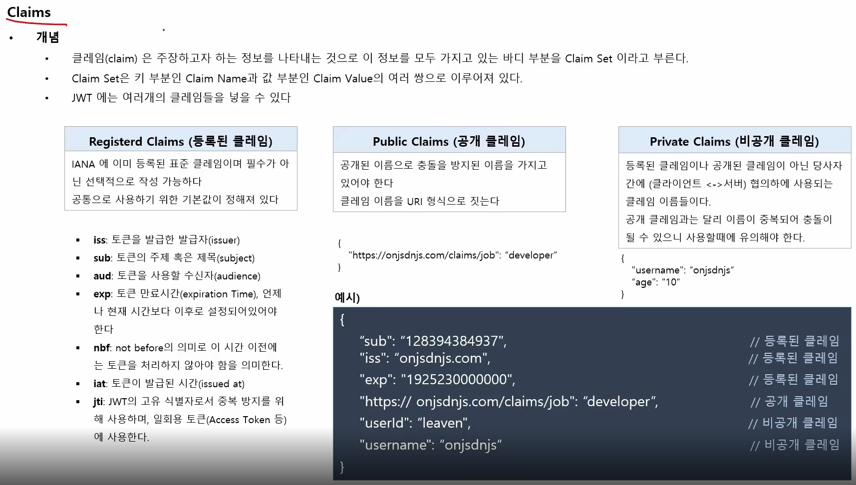 JWT(JSON Web Token) = 클레임 기반 보안값을 나타내는 방법으로 두 당사자간에 안전하게 전달되는 클레임을 표현하기 위한 개방형 표준