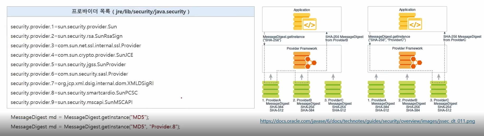provider가 여러개 존재하고 provider 저장소에서 해당 알고리즘의 적합한 구현체 클래스를 찾아 클래스 인스턴스를 생성할수 있다.