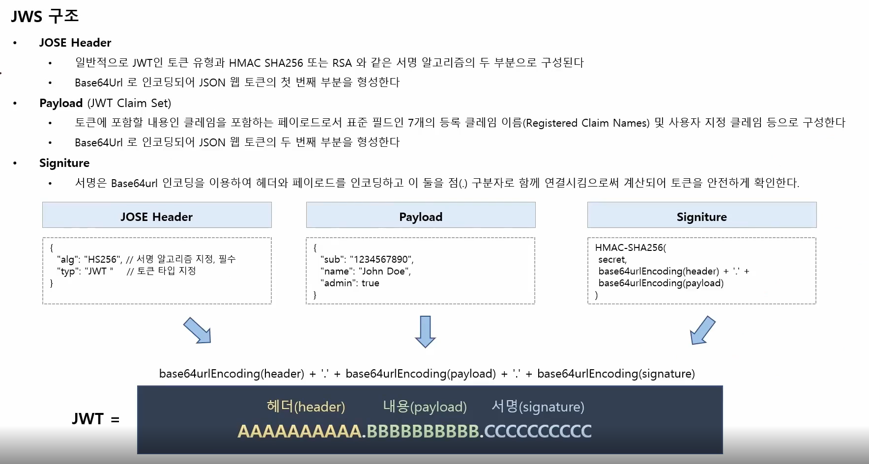 JWS (JSON Web Signature) = JSON을 사용하여 디지털 서명 또는 MAC으로 보안된 콘텐츠를 표현하는 방법 , 보통 이방식으로 JWT를 구현한다.