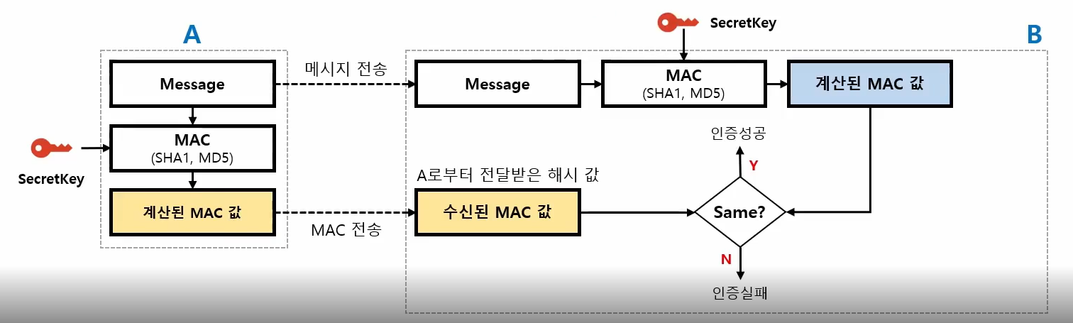 또한 Message Digest는 누구든지 무결성 검사가 가능하지만 MAC는 동일한 대칭키를 가진 쪽에서만 무결성을 검사할 수 있다.
