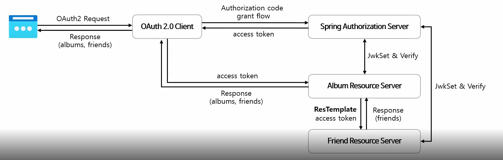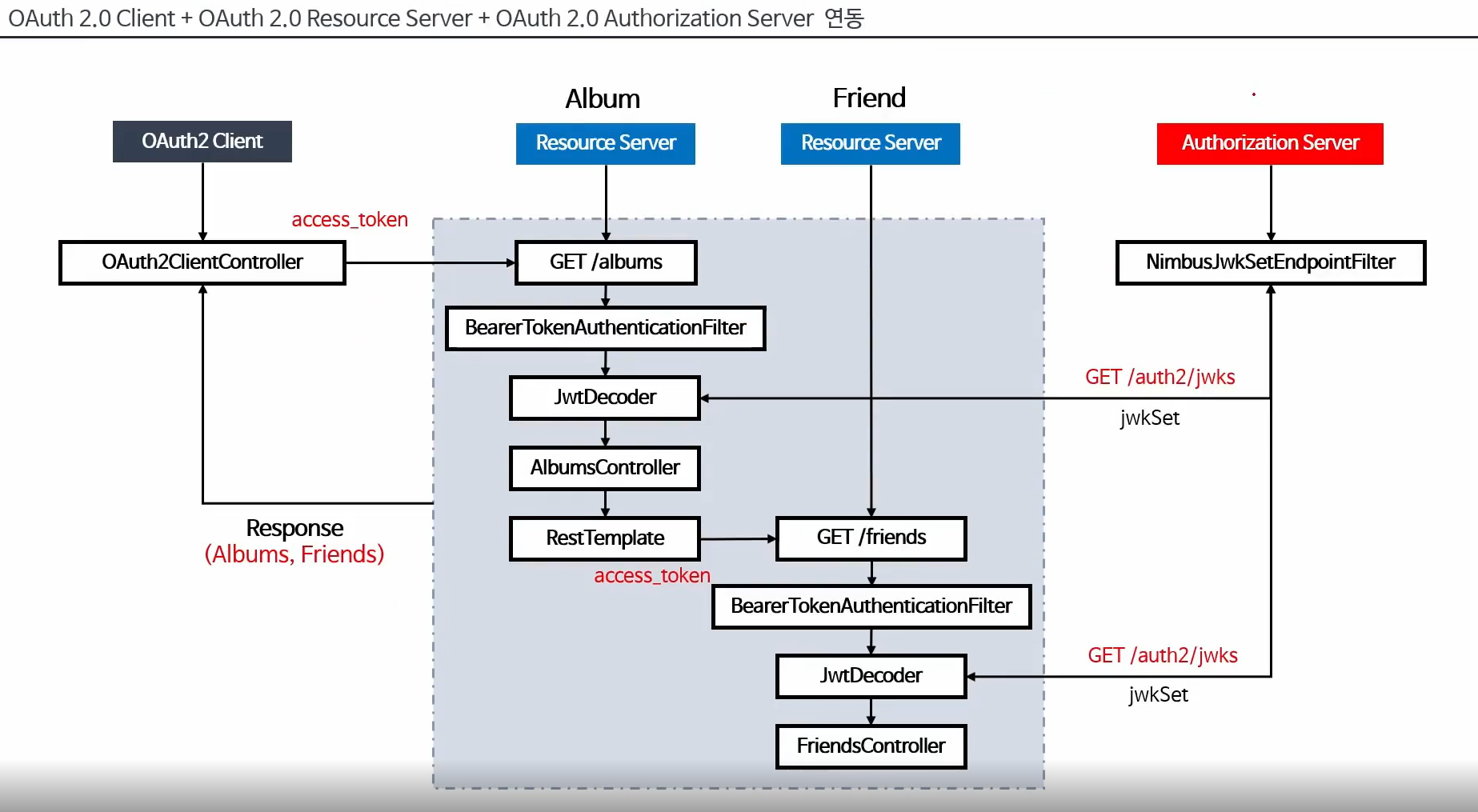 resource server에게 OAuth2Client 에서 Albums, Friends를 요청하는 과정