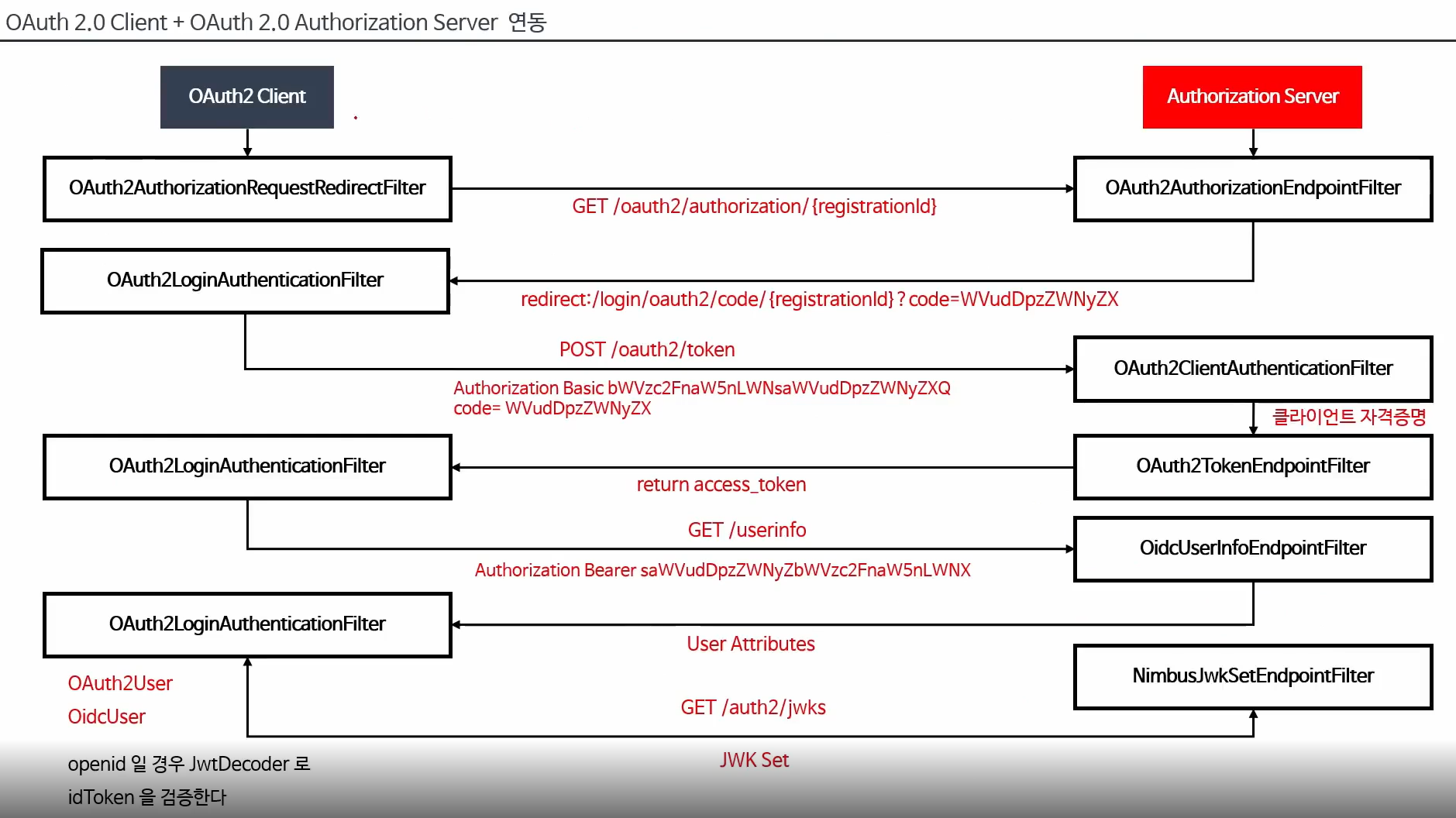 1. 클라이언트에서 인가서버로 Authorization code grant type으로 토큰을 발급받고 이후 사용자 엔드포인트 요청으로 인증을 진행한다.