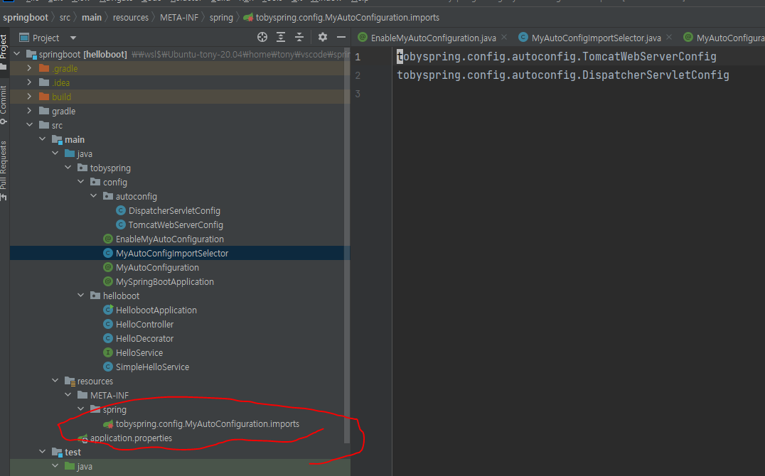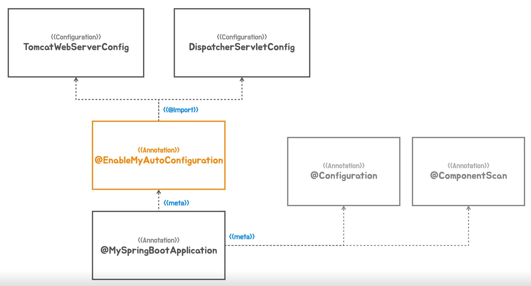 EnableMyAutoConfiguration 가 meta annotation 역할을 하고 해당 annotation 내부에서 @Import를 통해 @Configuration을 불러온것이다.