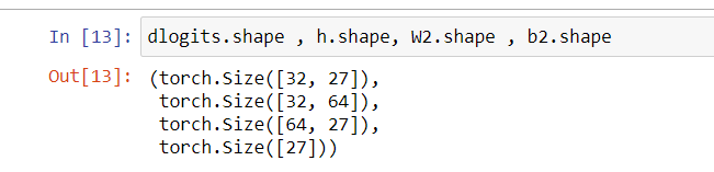 하지만 저 식을 쉽게 유도 할 수 있다. dh (32,64) = dlogits (32,27) * W2.T (27,64)
