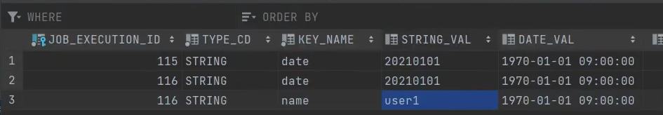 JOB_EXECUTION_PARAMS 테이블에서 116이 childJob에 해당하는 것이다. ParentJob의 ExecutionParams 도 물려 받았고 DefaultJobParametersExtractor를 통해 beforeStep listener에서 추가한 key, value값을 주입받을 수 있었던것이다.