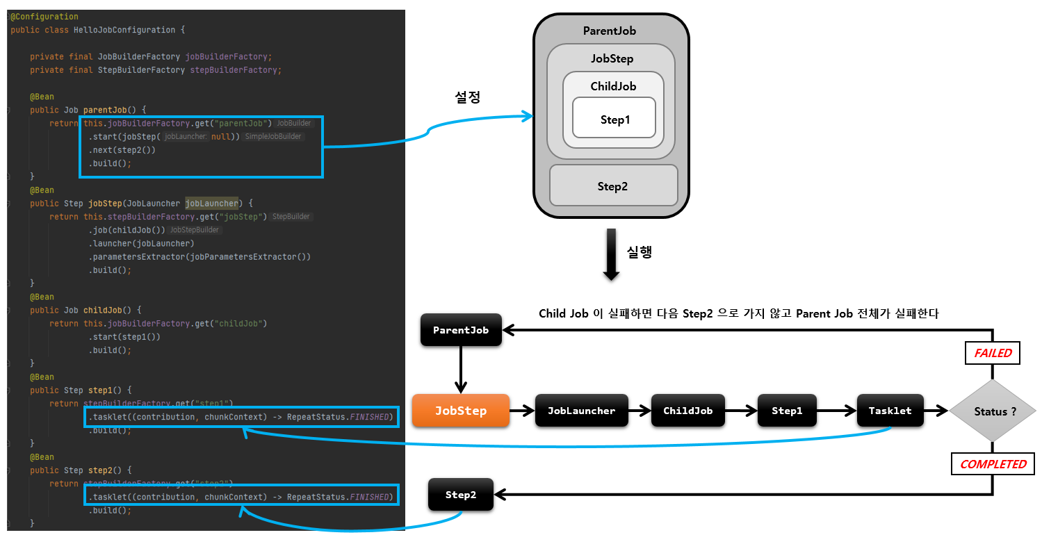 ParentJob 안의 JobStep 안에 ChildJob이 step1을 가지고 있고 또한 step2를 가지고 있다.