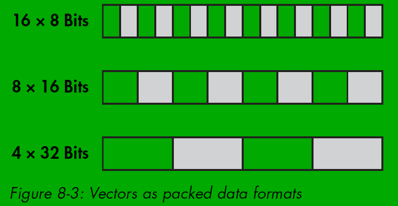16 elements, each element is an 8 bit signed or unsigned integer or an 8 bit character