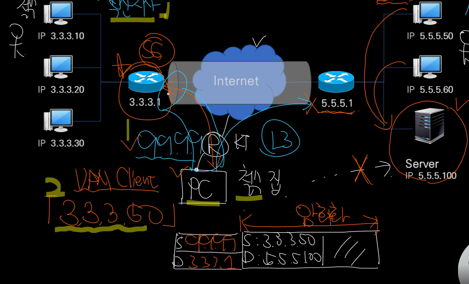 5.5.5.1 SG에 도착을 하면 바깥의 outer ip header를 때고 암호화된것을 복호화를 하여 server ip 5.5.5.100으로 무사히 전송시킨다.